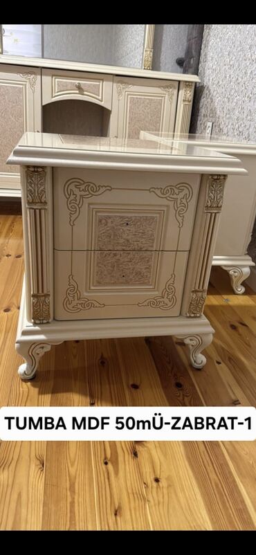 - Kiçik tumbə: 50 sm. Üst tabla dekorlu, iki çekmecə, kənarlarda oyma bəzəklər və klassik ayaqlar.