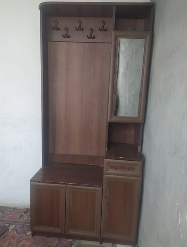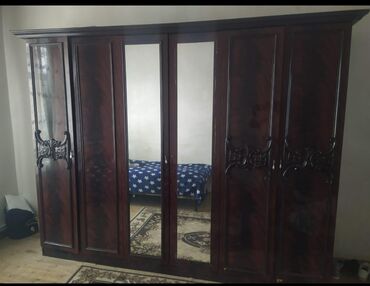 - Geyim dolabı: 6 qapılı, tünd qoz rəngli korpus, ortada 2 ədəd tam boy güzgülü qapı, dekorativ oyma elementlər, geniş asılqan və rəf hissələri üçün nəzərdə tutulmuş bölmələr.
