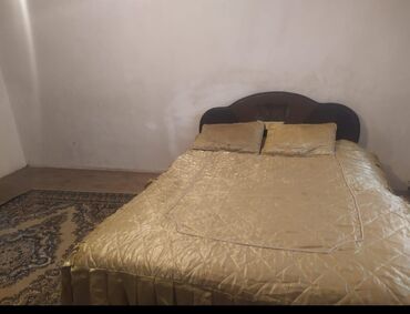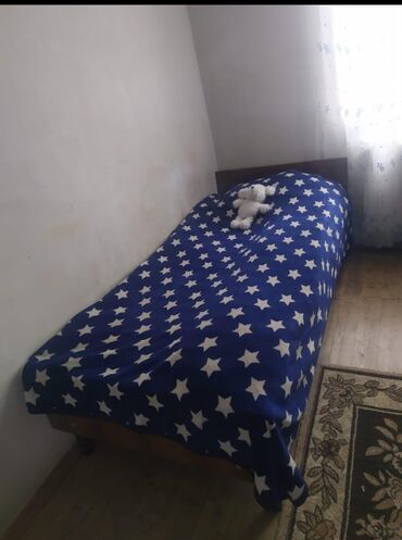- İki nəfərlik çarpayı: taxta başlıqla, klassik formalı, dəstdə uyğun rəngdə örtük və 2 yastıq üzlüyü görünür.