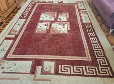 - Xalça: Dördbucaq formalı, əsas tonu tünd qırmızı-bordo, krem haşiyəli. Yunan düyün motivli bordür, iç hissədə krem panellərdə floral naxışlar. Parket və klassik mebellə harmoniyalı görünüş yaradır. Orta və böyük ölçülü otaqlar üçün münasib.