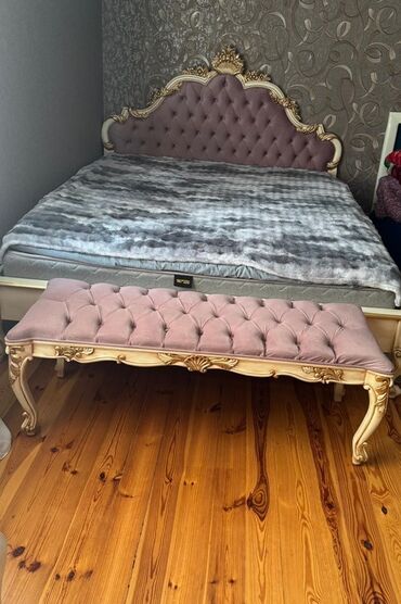 Klassik dizaynda yataq otağı dəsti Dest şeklinde satılır (Sökülüdü) Tərkib: - Cəhrayı-qəhvəyi, parlaq laklı massiv görünüşlü iki nəfərlik çarpayı (başlıq və ayaqlıqda oyma dekorlar, relyefli klass...