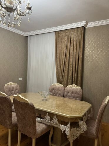 - Yemək masası və 6 stul: mərmər effektli düzbucaqlı/oval künclü masaüstü, dekorativ oyma ayaqlar, krujeva tipli masa örtüsü ilə göstərilib. Stullar yumşaq parça üzlü, arxalığında düyməli kapitone işləmə və krem rəngli çərçivə.