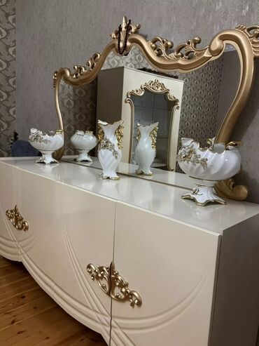 - Büfe-komod: iri güzgülü, dalğalı-qabarıq qızılı ornamentlər, dörd qapılı geniş saxlama bölməsi. Parlaq krem səth.