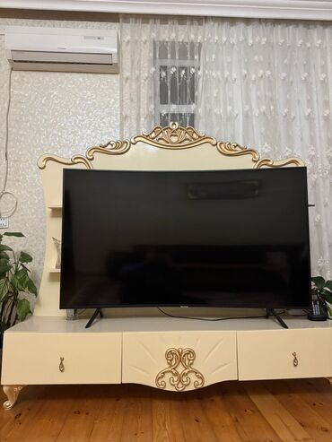 - TV stendi: krem rəngli, qızılı naxışlı dekor, 3 bölməli şkaf hissəsi və yuxarı dekorativ panel. Geniş üst səth və yan rəflərlə.