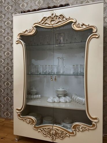 - Vitrin şkafı: şüşə qapılar, iki şüşə rəf, qızılı dekor çərçivə, qab-qacaq üçün geniş iç həcmi.