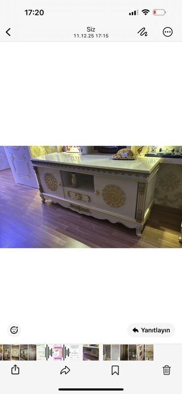 - TV tumbası/komod – mərkəzdə açıq rəf, yanlarda qapalı bölmələr, oyma qızılı dekor