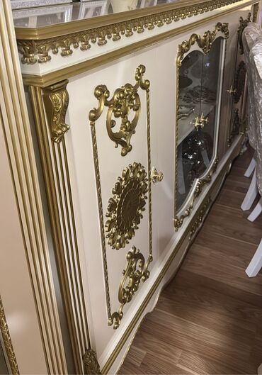 - Geniş konsol-bufet – üst hissədə böyük dekorativ güzgü paneli, içəridə qab-qacaq üçün bölmələr, şüşə qapılar və yan qapalı hissələr