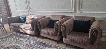 Klassik yumşaq mebellər dəsti - Tərkibi: 3 nəfərlik divan + 2 ədəd iri ölçülü kreslo (ümumilikdə 3+1+1). - Rəng: isti qəhvəyi/karamel tonlarında. - Material: yumşaq toxumalı parça üzlük, dekorativ...