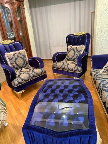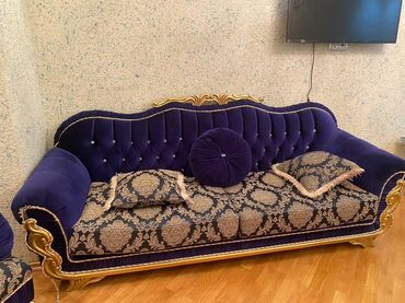 Klassik üslubda salon mebeli dəsti - Tərkibi: 3 yerlik divan, 2 yerlik divan, bir nəfərlik kreslo və uyğun puf/skamya. - Dizayn: Barokko motivli oyma qızılı detallar, əyri qol dayaqları, dekorativ...