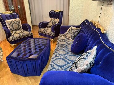 - Tərkib: 1 ədəd üçlü divan + 2 ədəd kreslo + dekorativ yastıqlar + 1 ədəd stol.