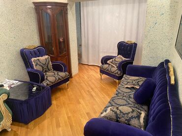 Bənövşəyi rəngdə 3 nəfərlik divan və uyğun kreslo dəsti. - Parça: yumşaq məxməri/velür tipli örtük, toxunuşu incə və rahat. - Dizayn: kapitone tikişlərlə romb naxışlı bel və ön hissə, parlaq dekor...