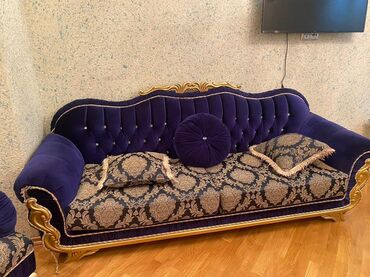 Mebel dəsti – klassik üslubda divan və iki kreslo - Üslub: klassik/barokko elementləri ilə - Rəng: tünd bənövşəyi (mor ton), dekorativ hissələr krem/ağ - Material: yumşaq məxməri toxuma (parça), y...