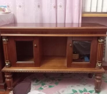 - TV stendi: üst tabla geniş, ortada açıq rəf, yanlarda şüşəli iki qapı, döngəli ayaqlar və sütun bəzəkləri.