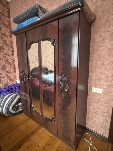 - Dolab: 5 qapılı garderob, ön hissədə iki ədəd tam boy güzgü, mərkəzdə asılqan və rəf bölmələri, yan tərəflərdə oyma dekor elementləri.