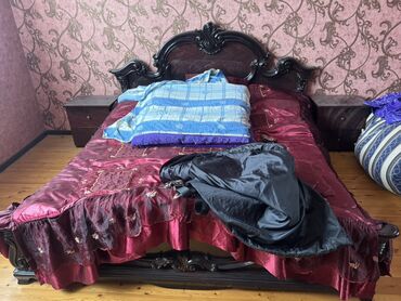 - Yataq: iri ölçülü çarpayı, taxtaboş başlıq və ayaqlıqda oyma dekorlu massiv konstruksiya. Yanlarda 2 ədəd tumbası var (çekmecəli).