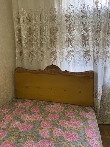 - Çarpayı: klassik üslubda, taxta başlıqla. Başlıq üzərində dekorativ oyma elementlər və yumşaq parça işləməsi var. İkiqat ölçülü döşək ilə birlikdə göstərilir (çiçək naxışlı üstlük).