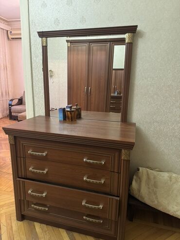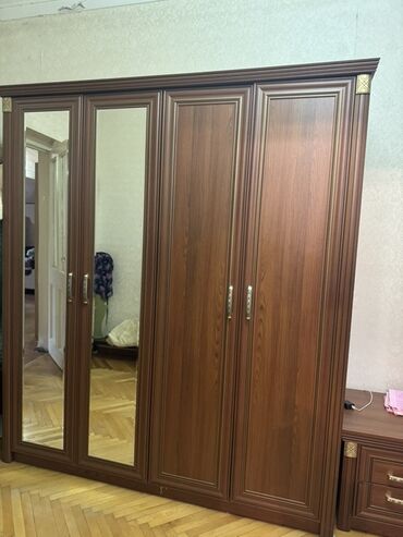 - Dolab: 4 qapılı, qəhvəyi taxta teksturasında. İki tam ölçülü güzgülü qapı, rahat tutacaqlar və yuxarı künclərdə dekorativ elementlər. Geniş saxlama imkanı.