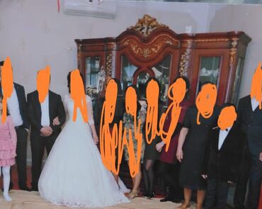 Klassik üslubda massiv ağac görünüşlü vitrin-bufet - Material və rəng: tünd qoz tonlarında, zəngin oyma naxışlı fasad və karnizlər, antik tərz metal tutacaqlar - Konstruksiya: ortada iki şüşə qapı...