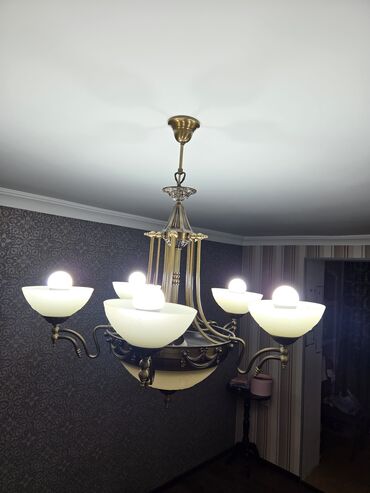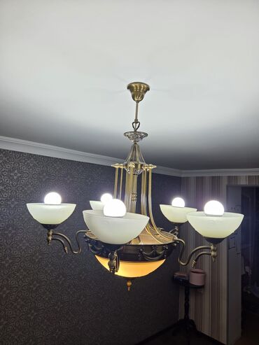 Klassik tavan çilçırağı - 6 lampalı dizayn: mərkəzdə böyük şüşə plafon və ətrafında 5 ədəd yarımkürə formasında plafon. - Şüşə plafonlar südü-ağ rəngdədir, işığı bərabər yayır, göz yoxlamasını aza...