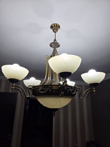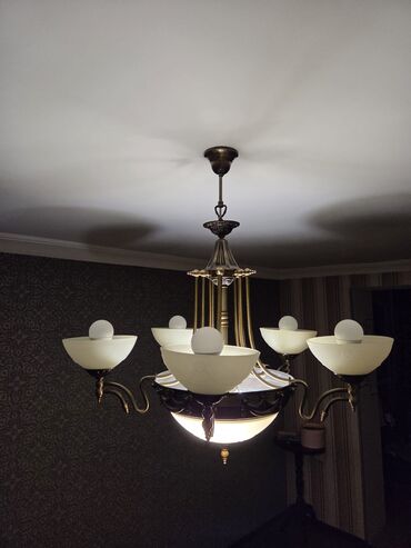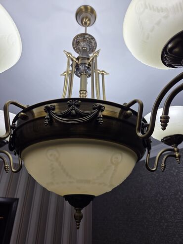 Klasik üslublu tavan lustrası - Material: tökmə metal gövdə (antik bürünc tonlarında) və mərmərə bənzər şüşə/plafon kasa - Dizayn: ornamental naxışlı, yelkənvari qollar, mərkəzdə dekorativ şəbəkəl...