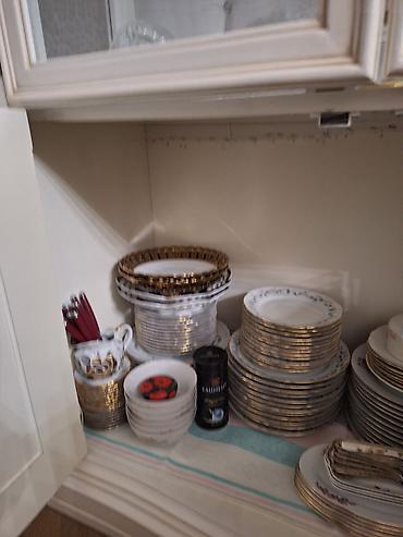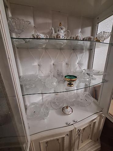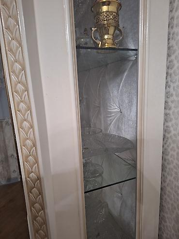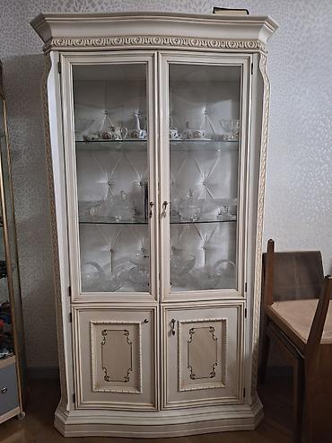 Klassik üslubda vitrin-bufet - Rəng: krem, qızılı naxış və relyef ornamentlər - Material: MDF korpus, ön hissədə geniş şüşə vitrin qapıları; içəridə şüşə rəflər - Dizayn: barokko tərzli oyma dekor...