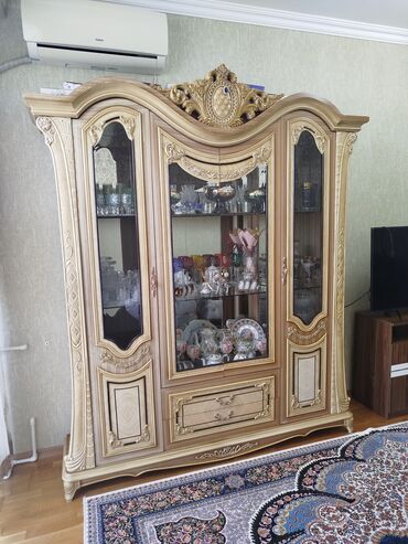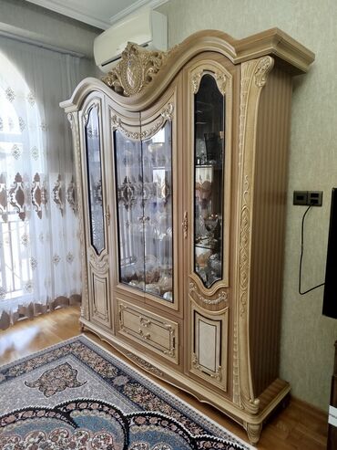 Zərif klassik interyerlərə uyğun, qonaq otağında qab vitrini, bufet və ekspozisiya şkafı kimi funksional istifadə üçün ideal. Şüşə vitrinlər ekspozisiyanı ön plana çıxarır, alt çekmecə və bölmələr isə səliqəli saxlama təklif edir.