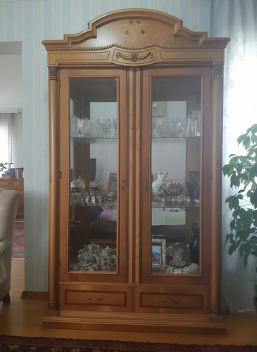 Şüşə vitrinlər ekspozisiya üçün, aşağı çekmecələr isə əlavə saxlama üçün praktik həll təklif edir. Classic görünüşü və dekorativ oyma detalları məkanı zərif göstərir.
