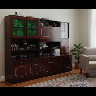 Klassik qonaq otağı üçün bufet-vitrin dəsti - Material: parlaq taxta/qablaşdırılmış MDF görünüşlü, tünd qəhvəyi rəng - Komplekt: iki hissə 1) Sağ tərəf – 3 qapılı böyük vitrin: ortada şüşəli iki...