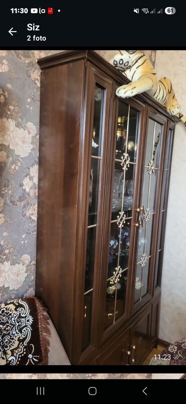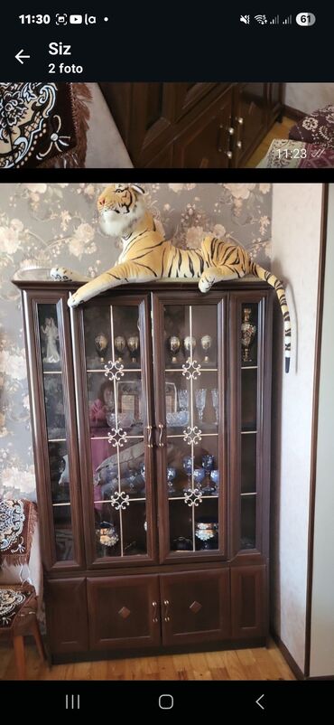 Tecili satılır! Klasik üslubda böyük vitrin-bufet, Qorka İşlənmişdir - Material: ağac (qoz rəngli), ön hissələrdə şüşə vitrin qapıları - Dizayn: yuxarı hissədə oyma dekor, yumru künclər, zərif p...