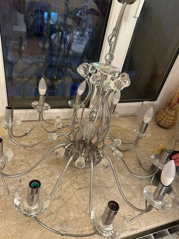 Müasir kristal çilçıraq - Material: xrom korpus, çoxsaylı şəffaf kristal asqılar və zəncirlər - Dizayn: radius boyu yayılmış metal qollar, hər qolun ucunda güzgü effektli kasalar və iri-kik krista...