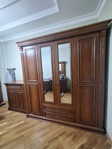 Mebel dəsti – qarderob şkafı və komod - Material: ağac teksturalı laminat/MDF görünüşlü, klassik dizaynlı frezeli ön panellər - Rəng: qoz-qəhvəyi - Qarderob: 3 qapılı - Orta qapıda tam boy güzgü...