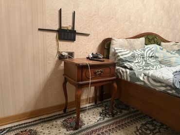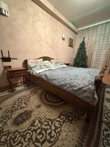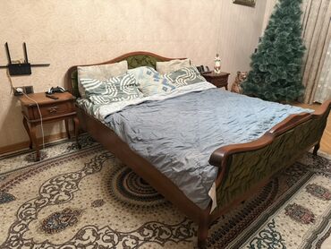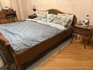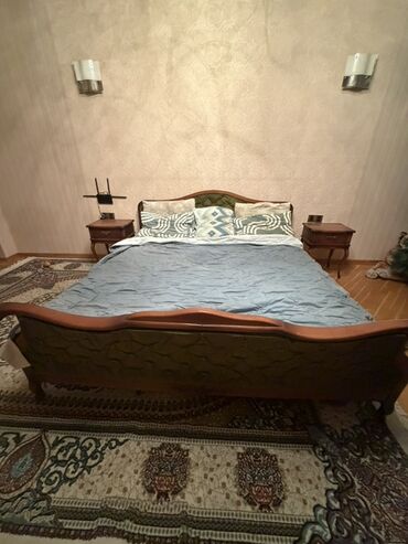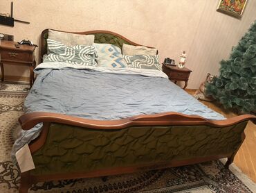 - Çərçivə: Təbii ağacdan hazırlanmış iki nəfərlik yataq. Ön və arxa başlıqda incə oyma detallar, yumşaq parça ilə kapitone elementlər. Yanları dalğalı xəttlər, taxta ayaqlar.