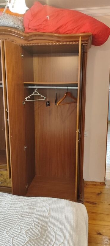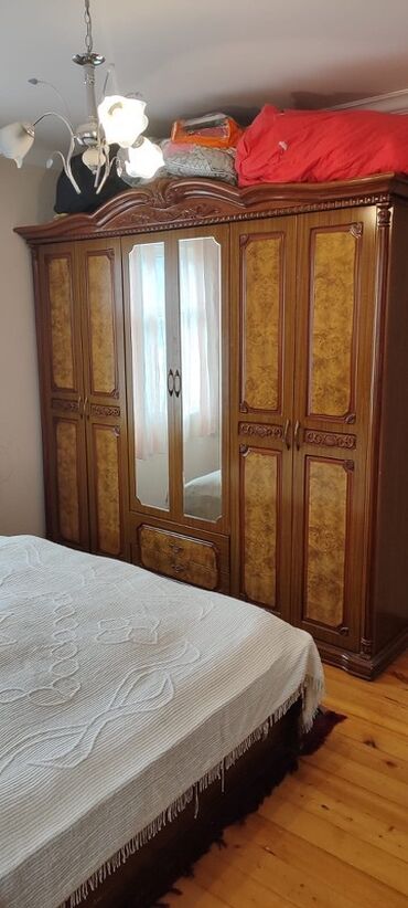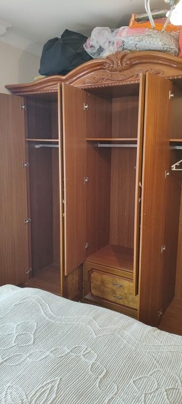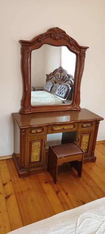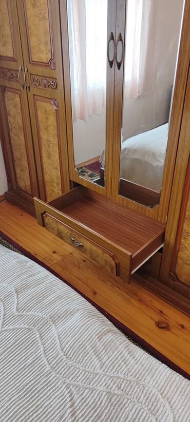 Yataq otağı dəsti – klassik və zərif dizayn Tərkibi: - Çarpayı (yumşaq başlıq, qızılı detallar) - 2 ədəd tumba - Güzgülü makiyaj/komod masası (çekmece və dolab bölməsi ilə) - 4 qapılı şkaf: orta h...