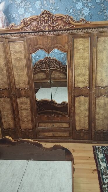• Geniş 5 qapılı şkaf – ortada güzgülü ikiqat qapı, aşağıda çekmecələr