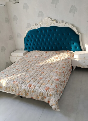 - Böyük ölçülü çarpayı: zümrüd-yaşıl rəngdə, kapitone işləməli, dekorativ düyməli, ağ-qızılı oymalarla çərçivələnmiş yüksək başlıq.