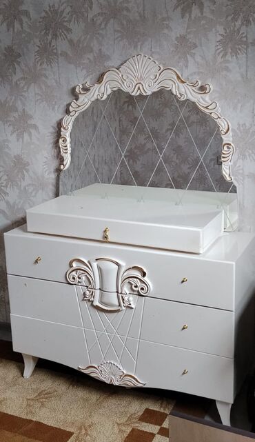 - Sürgülü dolab: bir tayında iri, oyma çərçivəli güzgü, digər tayında parlaq ağ səth və zərif relyef xətləri. Zəngin klassik ornamentlər bütün dəstdə eyni üslubu tamamlayır.