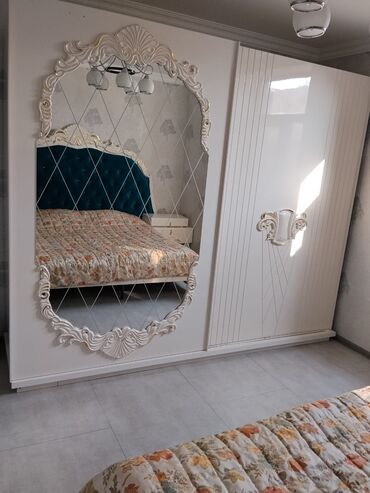 Klassik üslubda krem rəngli mebel dəsti Tərkibi: - Yataq otağı üçün çarpayı başlığı ilə birlikdə iki sürüşkən qapılı, güzgülü iri şkaf. Ön panellərdə dekorativ dalğalı oyma və romb naxışları, yumr...Razılaşma yolu ilə