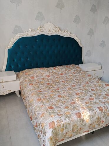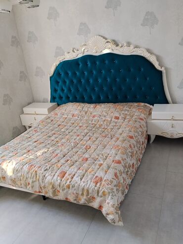 Klassik üslubda mebel dəsti - Yataq dəsti: Yumşaq başlıqlı (parça üzlü) iri ölçülü çarpayı. Başlıqda qızılı dekor xətti, qalın süngərli panel quruluşu. Dəstə uyğun iki ədəd tumba – üzərində bəzəkl...
