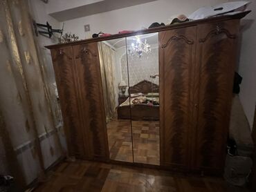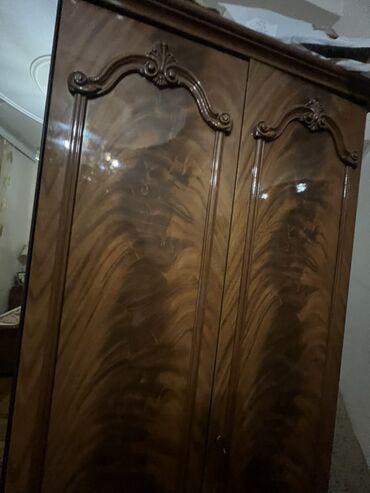 - 5 qapılı iri qarderob: iki orta qapı tam boy güzgülüdür, yan qapılarda dekorativ relyeflər və klassik oyma elementləri var. Taxta teksturası parlaq laklı örtüklə vurğulanıb. Geyim asmaq üçün bölmələr və rəflər nəzərdə tutulub.