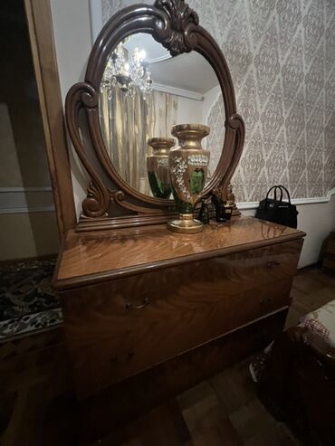 - Tualet masası/komod: üst hissədə böyük oval güzgü dekorativ çərçivə ilə, aşağı hissədə geniş saxlama üçün iki dərin çekmece. Üst səth parlaq laklıdır, taxta naxışlı tekstura ilə.