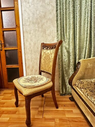 - Stullar: 6 ədəd. Ağac karkas, arxalıqda oyma elementlər, zərif naxışlı parça ilə üzlənmiş bel hissəsi. Oturacaq hissəsi yumşaq süngərli, klassik ornamentli parça ilə kapron. Taxta ayaqlarda dekorativ oyma və relyefli detalları var.