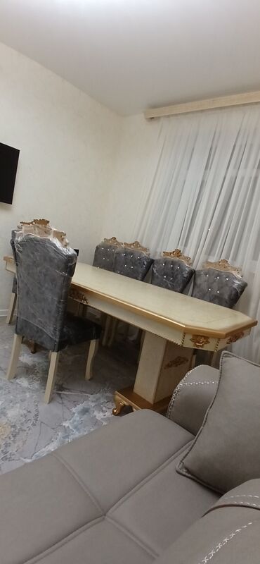 Yemək otağı dəsti – masa və 6 ədəd stul 950 azn alınıb. 3 aydır Evi deyişirik deye satilir. - Stil: Klassik-modern qarışığı, açıq krem rəngli masa, qızılı dekor xətləri və parlaq top formalı bəzə...