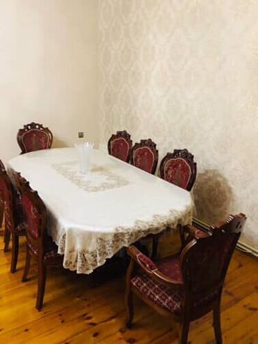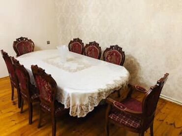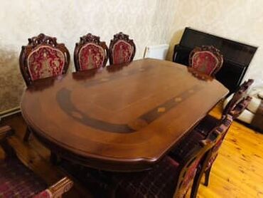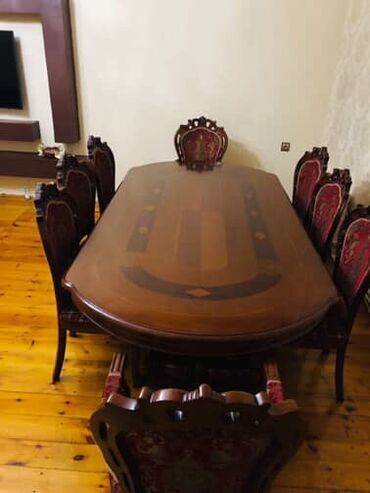- 8 ədəd stul: 6 adi + 2 qoltuqlu kreslo tipli baş stul. Taxta karkas, oyma arxa hissə, məxmər tərzli qırmızı/parça üzlük və naxışlı dizayn.