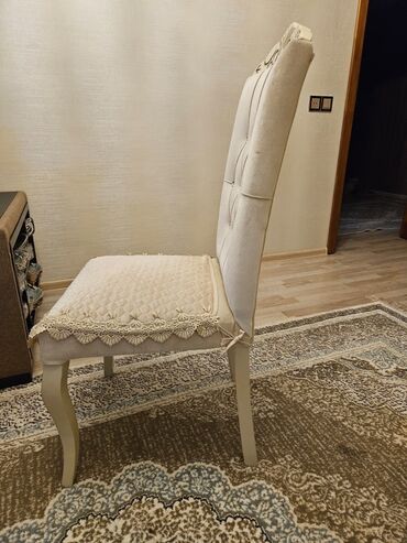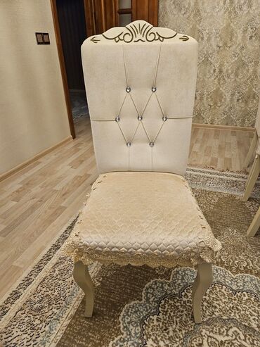 - Stullar: Açıq krem rəngli, yüksək arxalı. Arxa hissədə dekorativ oyma başlıq və romb naxışlı kapitone (kristal tipli düymələrlə) işləmə. Oturacaqda krem rəngli, zərif krujeva kənarlı örtük. Ayaqlar klassik qıvrımlı formadadır, stul örtüyü yanlardan bağlama ipləri ilə sabitlənir.