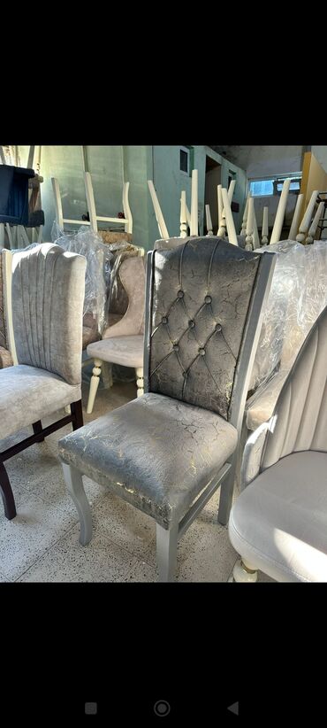 - Stullar: ağ rəngli taxta karkas, əyri ayaqlar, bel hissəsində kapitone tikiş və dekorativ düymələr