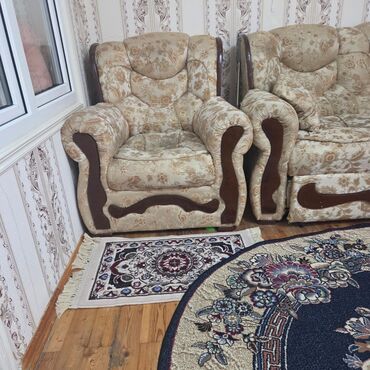 Divan və kreslolar yaxşı vəziyyətdədir 3 hissəli yumşaq mebel dəsti Tərkibi: - 3 nəfərlik divan - 2 ədəd geniş kreslo Dizayn və material: - İsti qəhvəyi və krem rənglərinin kombinasiyası - Yumşaq...