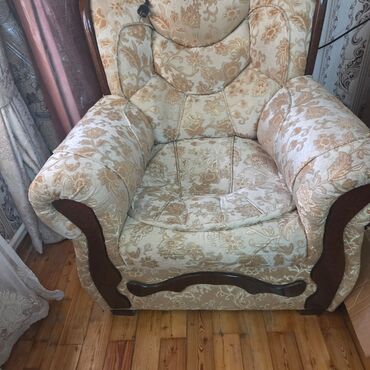 Klassik üslubda salon dəsti - Tərkib: 3 nəfərlik divan + 2 böyük kreslo (şəkillərdə) - Rəng: bej tonlarında, üzərində zərif naxışlı parça - Dizayn: qalın, yumşaq oturacaq və bel hissəsi; geniş, ya...