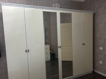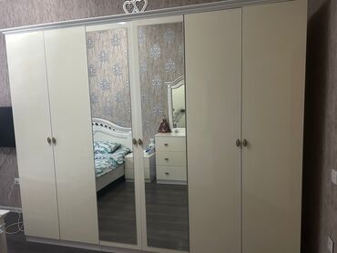 Ağ rəngli yataq otağı dəsti – klassik və zərif dizayn. Tərkibi: -3 qapılı şkaf: mərkəzdə güzgü paneli, dekorativ qızılı tutacaqlar, alt hissədə baza. - 4 qapılı şkaf: iki güzgülü qapı, aşağıda 2 ç...