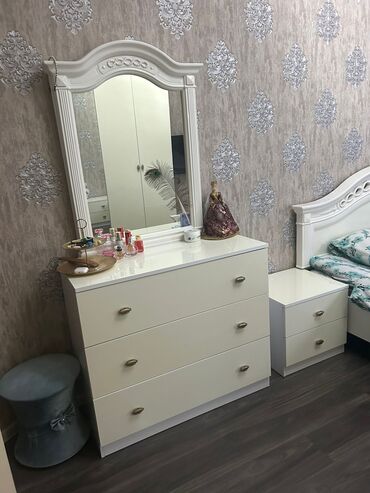 Yataq otağı dəsti – klassik dizayn Komplekt: - Yumşaq başlıqlı, kapitone işləməli geniş çarpayı - 2 ədəd tumbə (naxışlı qızılı detallar, oyma ayaqlar) - Güzgülü tualet masası/komod (4 çekmece, dek...