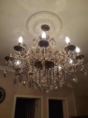 TƏCİLİ SATILIR Klassik üslubda, kristal bəzəkli tavan çilçirağı - Material: parlaq xrom rəngli metal gövdə və çoxsaylı şəffaf kristal asqılar (armud/yaş damcısı forması). - Dizayn: çoxqollu konst...